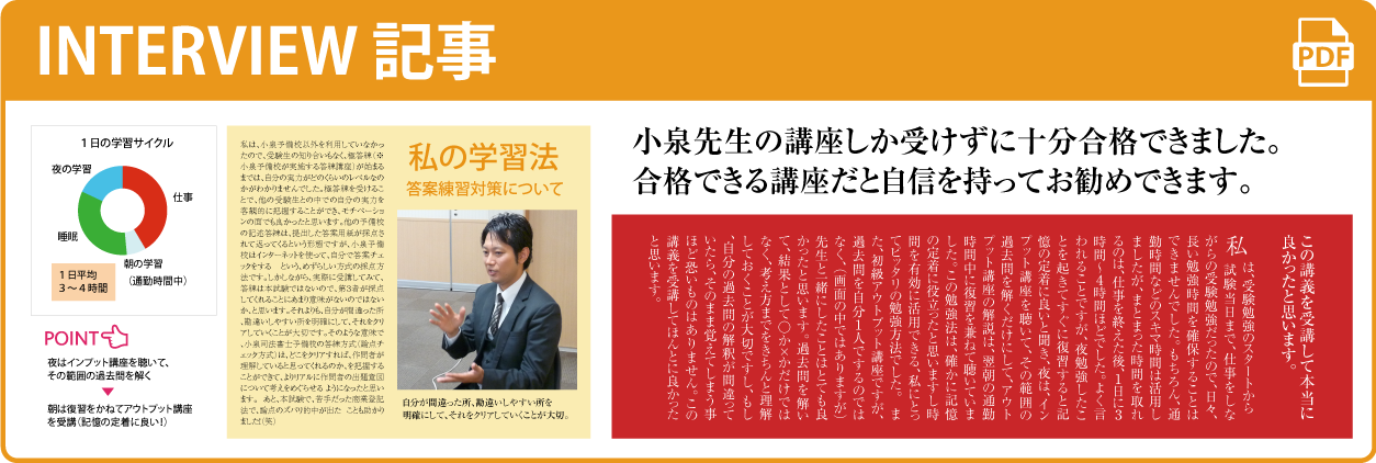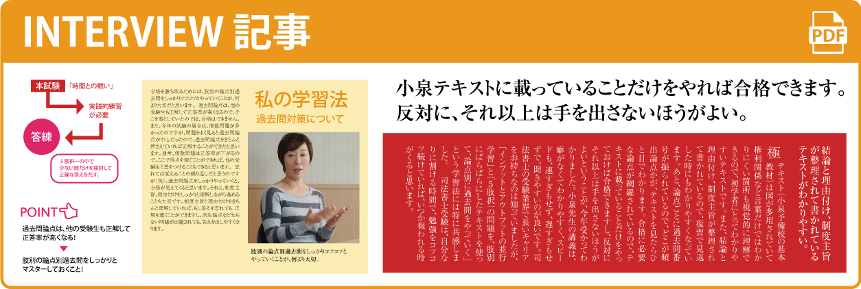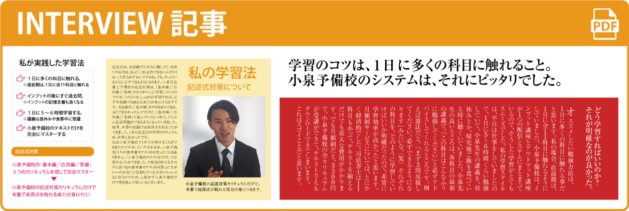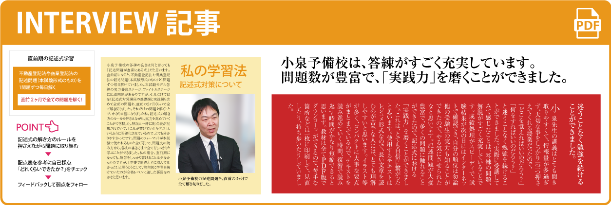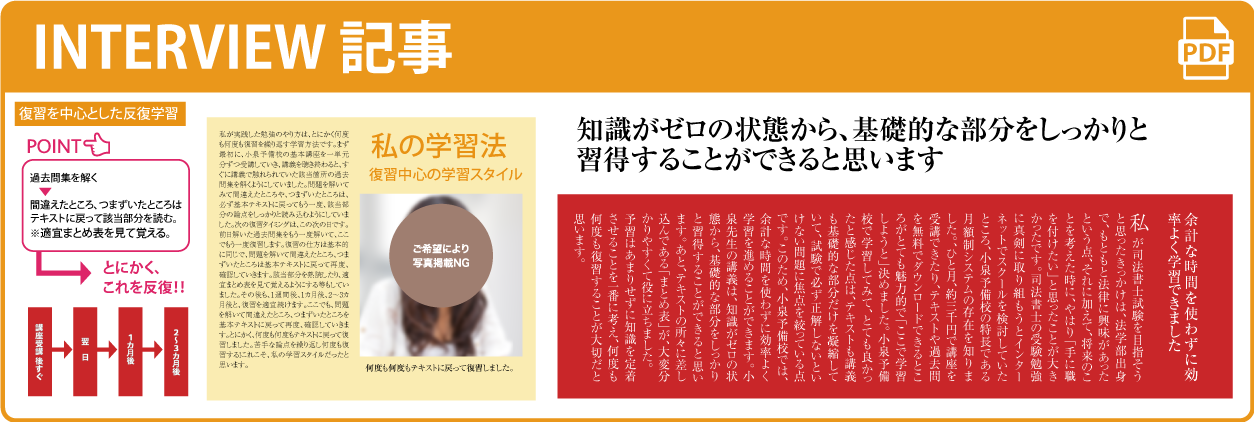 小泉予備校合格者から頂いた「これから学習を始める司法書士受験生への学習アドバイス」をもれなく掲載しています。 司法書士合格者がどのように学習していたのか?小泉予備校をどのように活用していたのか?これらのアドバイスは、司法書士受験をする上で非常に参考になる意見が多数あります。 合格された皆さんの小泉予備校活用法をリアルに感じていただき、これからの学習に役立てて頂ければと思います!