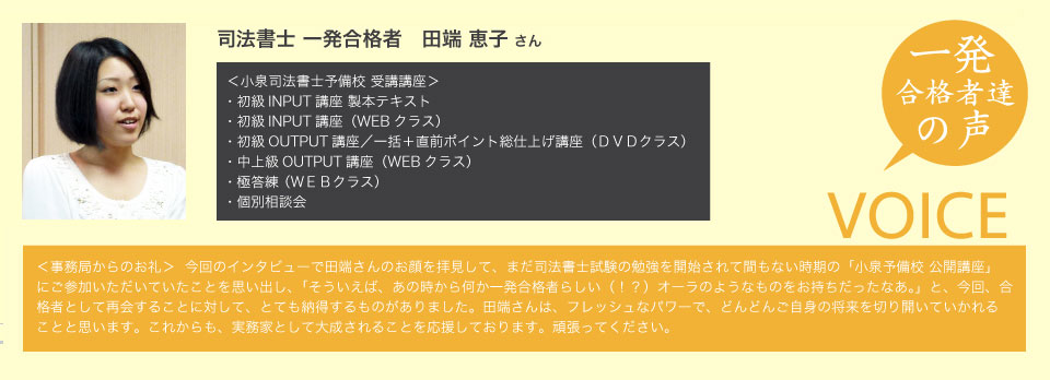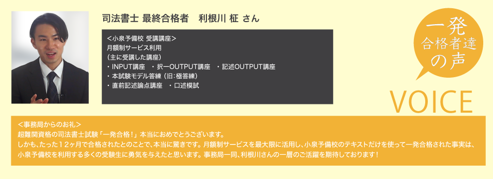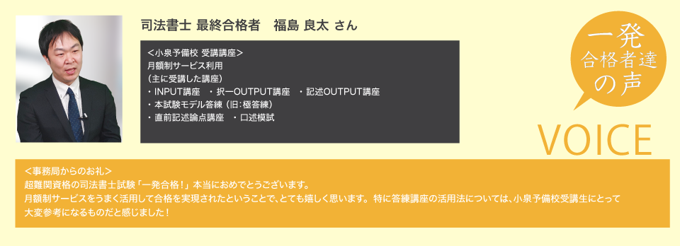 瀬戸さん:僕は、小泉先生の講座しか受けずに十分合格できました。これから目指される方にも、十分合格できる講座だと自信を持ってお勧めできます。司法書士試験は、確かに難しいですが、正しい勉強の仕方で頑張っていけば、短期合格することも可能 だと思います。頑張ってください。