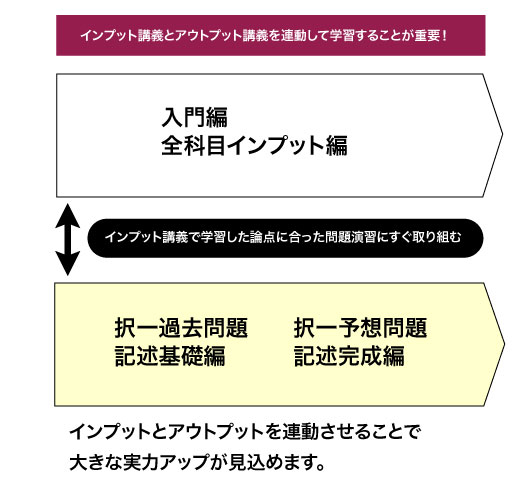 インプット講義で学習した論点にピッタリ合った問題演習(択一過去問題・択一予想問題)にすぐ取り組むことで、「過去問論点」と、まだ過去に出題されていない小泉嘉孝オリジナルの「出題予想論点」を、効率よく短時間でマスターすることができます。