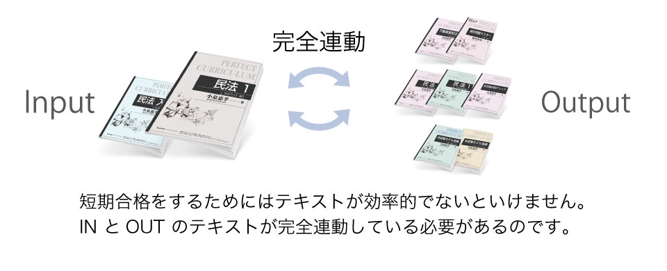 基幹講座で使用するテキスト「インプットテキスト」は、「アウトプットテキスト」と完全対応しており、イラストや図表が多く、難解な法律書のイメージを払拭する全く新しいテキストです。小泉嘉孝が「一発合格者を多数輩出する理由」の1つとしてあげるのが、このテキストの存在です。初級者にとっては、長々と文章を読まずに直感的にどんどん読み進めていくことができ、ポイントだけが記憶に定着しやすいつくりになっています。